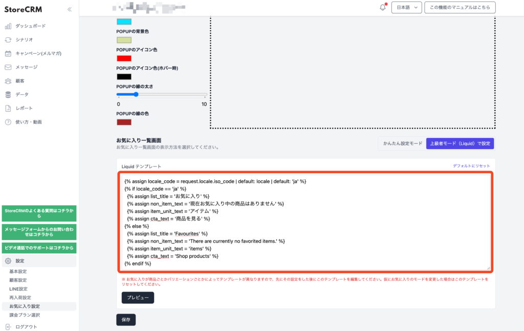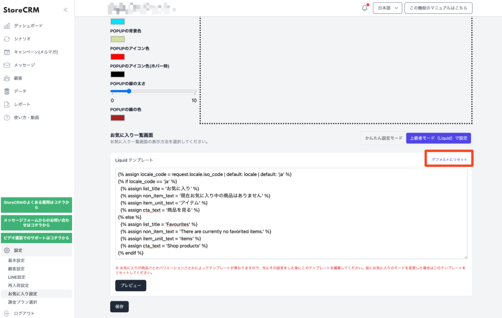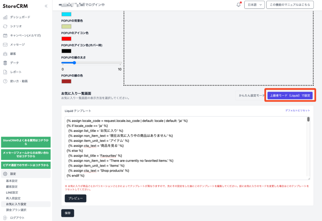 StoreCRMの[設定]>[お気に入り設定]より、お気に入り一覧画面の編集が可能です。デフォルトでは[かんたん設定モード]が選択されている状態ですが、[上級者モード(Liquid)で設定]を選択することで、Liquidテンプレートを編集してのお気に入り一覧画面のカスタマイズが可能となります。
