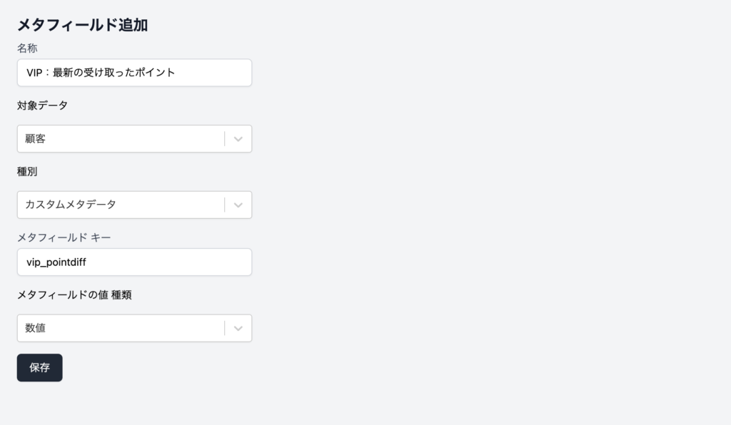 メタフィールド キー:③で指定したMeta keyの値(ここでは、vip_pointdiffと入力して進めていきます)