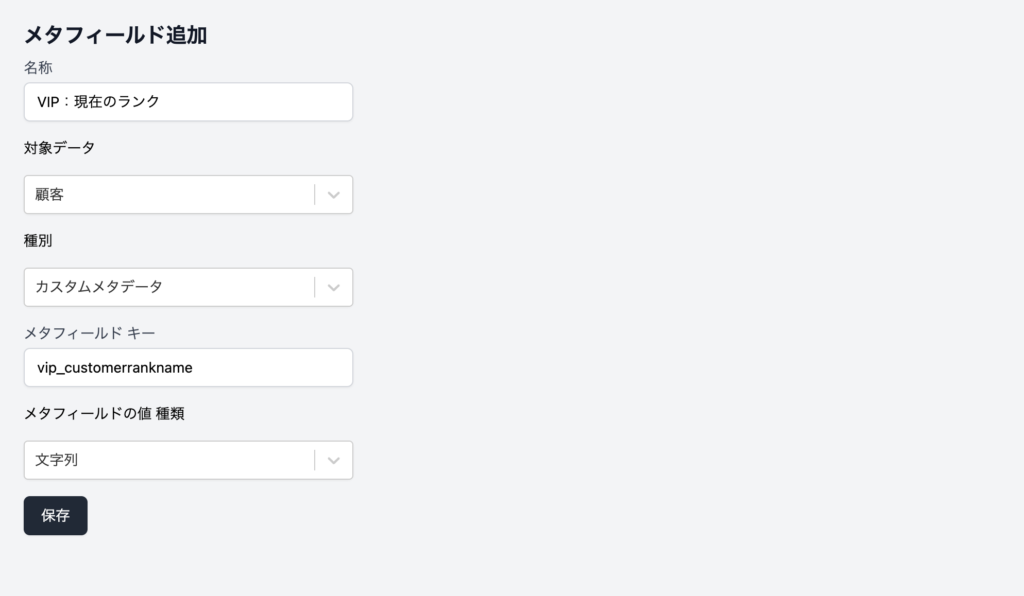⑤StoreCRMが現在のランクの情報を保持するために、StoreCRMの画面へ移動し、[データ]>[メタフィールド一覧]から新しくメタフィールドを追加します。メタフィールドの追加画面では、下記の通りに入力を行い保存をしてください。