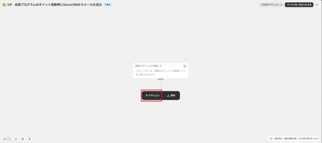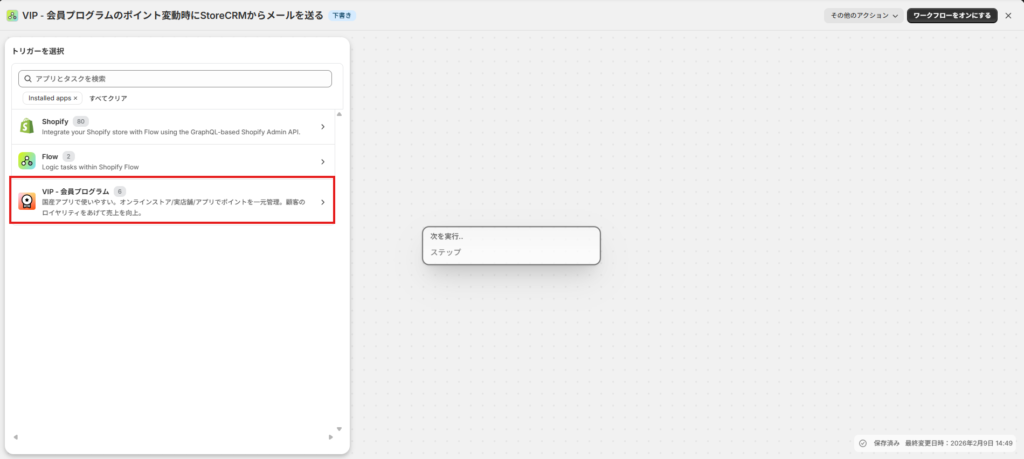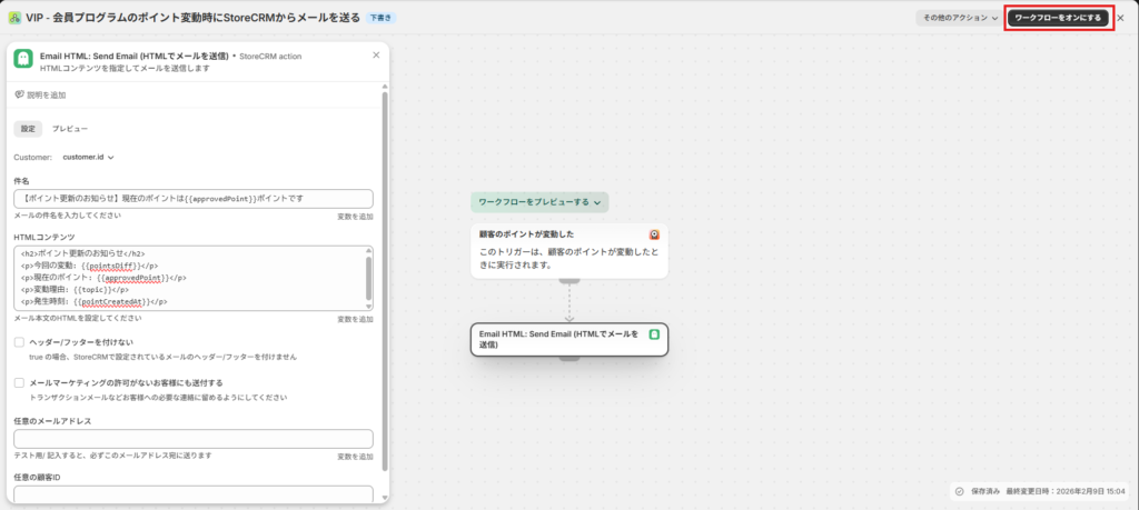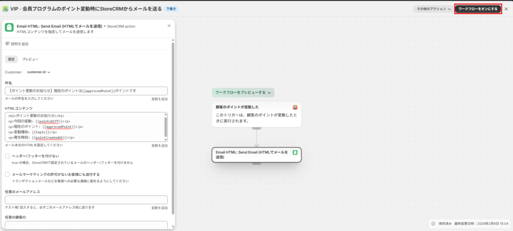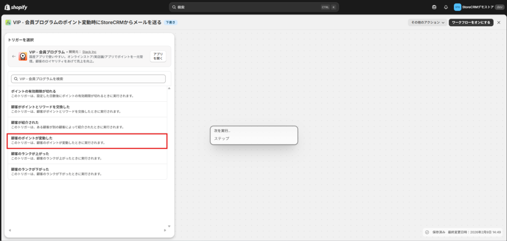 ここでは例として、「VIP ‑ 会員プログラムのポイント変動時にStoreCRMからメールを送る」に設定しました。
