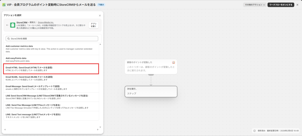 今回は、メッセージ内でVIPの「顧客のポイントが変動した」トリガーから与えられる、変数を活用したいため、「Email HTML: Send Email (HTMLメールを送る)」を利用して説明を進めます。