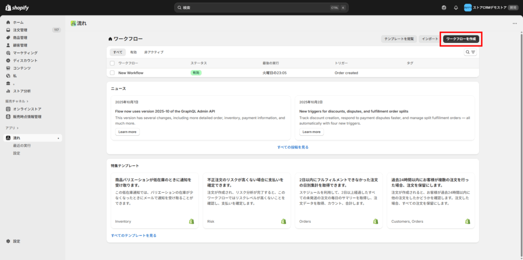 1. Shopify→[アプリ]をクリックし、「Flow」と入力します。