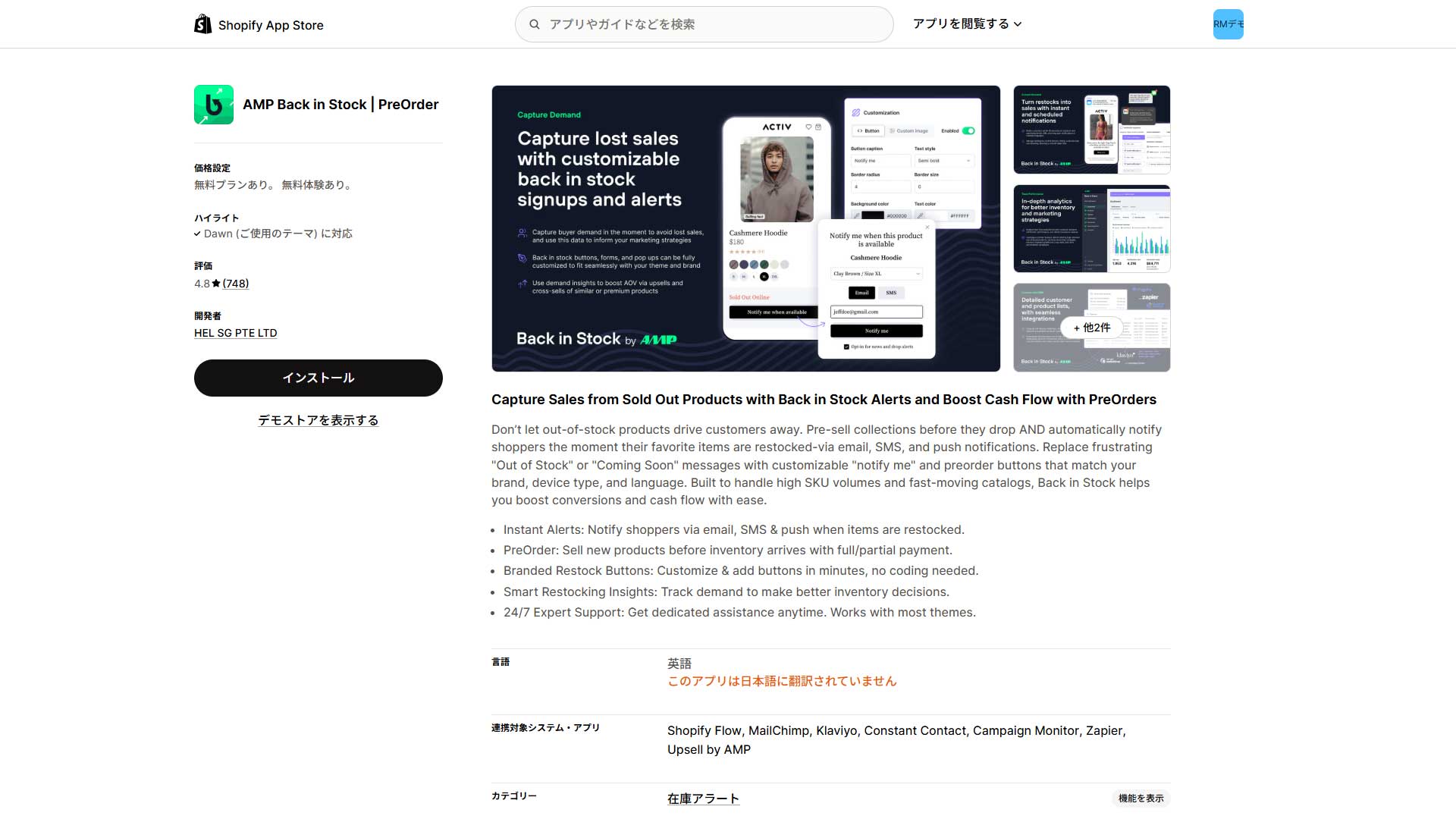 | AMP Back in Stock | PreOrder | ◎ | △(一部日本語) | ◎ | △ | × | ◯ | △ | × | 低価格で再入荷に強い | 再入荷、予約販売、メール通知 |
