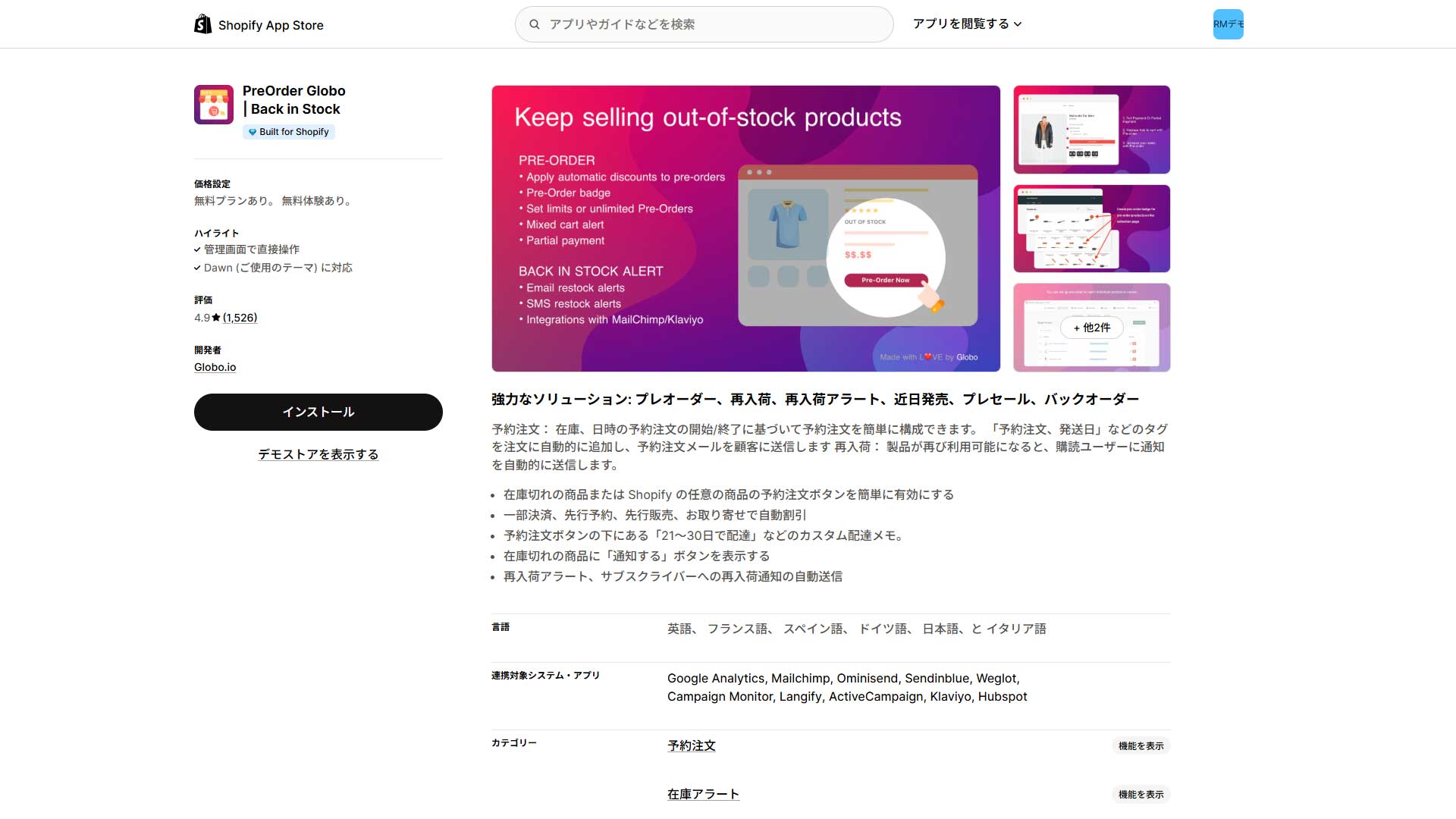PreOrder Globo | Back in Stock(プリオーダー・グローボ|バックインストック)は、在庫切れ時の機会損失を防ぎ、売上を伸ばすためのShopifyアプリです。商品ページ上に「Notify Me/再入荷通知ボタン」を設置でき、入荷時には顧客に自動で通知メールが配信されます。さらに、予約販売(Pre-Order)機能も備えており、在庫が回復する前に販売を受け付けることで売上機会を確保できます。これにより、「売り切れ=販売終了」ではなく「売り切れ=次の販売機会」を作り出すことができます。また多言語対応・テーマ互換性の高さ・通知メールテンプレートのカスタマイズなどにも対応しており、グローバル展開や多SKU運用にも強みがあります。ただし、純粋な日本語サポートやUI最適化という点ではやや他の国内特化アプリに劣る面もあるため、日本市場向けストアの導入時にはテーマや表示確認を含めた事前チェックを行う必要があります。