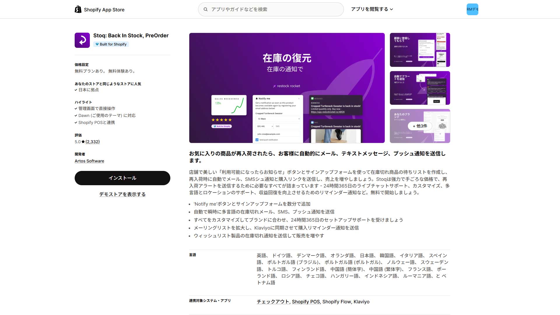 Stoqは管理画面は英語ですが、ボタン文言や通知メールは日本語にカスタマイズ可能です。設定画面はシンプルで扱いやすく、低コストで再入荷通知を導入したいストアに最適です。他アプリと比較すると、PreOrder Globoが柔軟性に優れる一方、運用のしやすさではStoqの方に軍配が上がります。「再入荷通知と予約販売を両方使いたい」というストアにぴったりのアプリです。