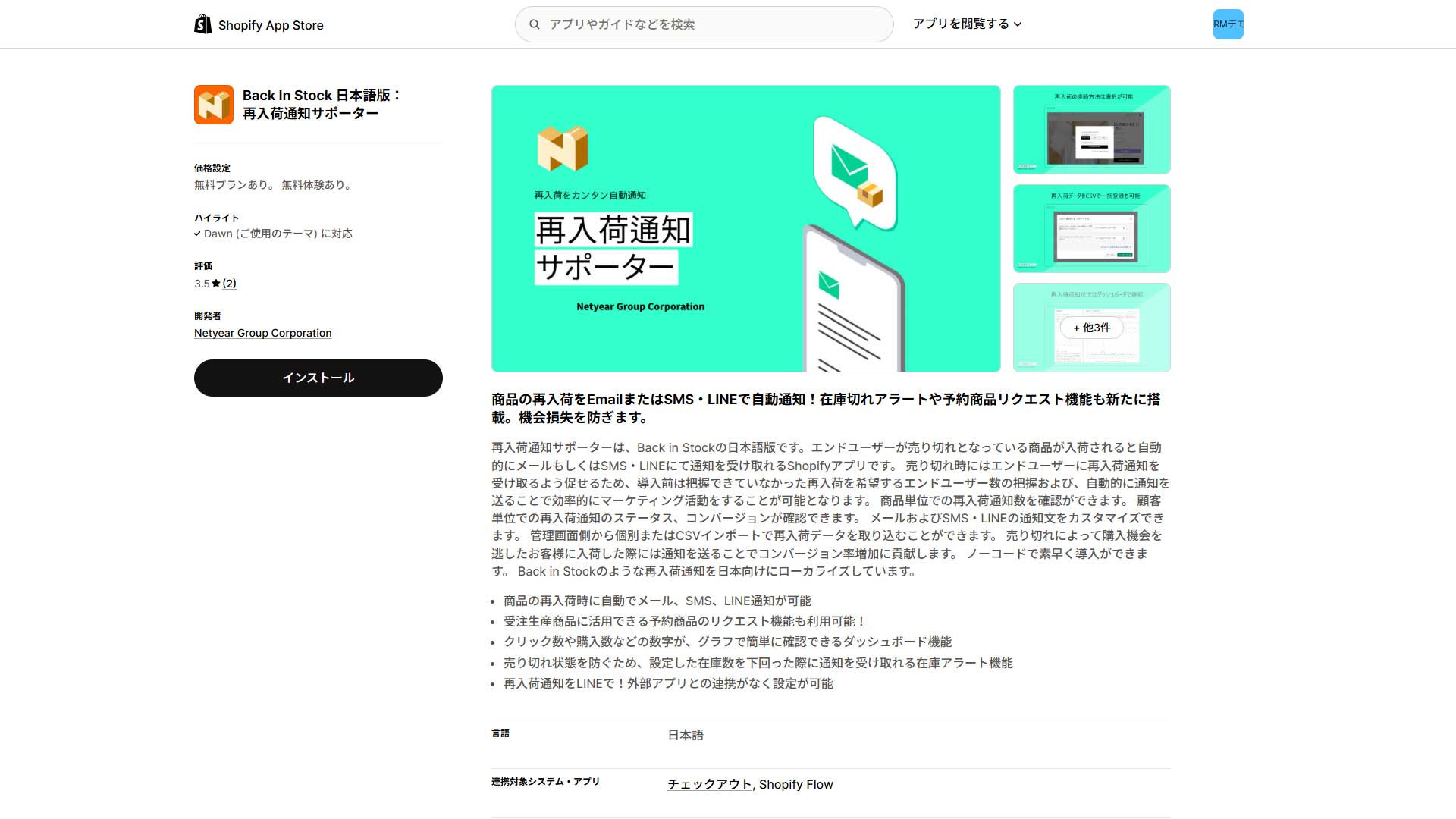 Back In Stock 日本語版:再入荷通知サポーターは、在庫切れ商品が再入荷した際、顧客へ自動でメールや、外部アプリ併用でLINE通知を送ることができる日本語対応アプリです。LINE通知は、外部連携アプリやShopify Flowを併用することで設定可能です。売り切れのときに「再入荷を知らせてほしい」と登録された顧客数を把握できるため、需要の見える化にも役立ちます。通知ボタンの設置や通知文のカスタマイズもノーコードで可能です。また、在庫数が一定の閾値を下回った際にストア側に通知が出る「在庫アラート機能」も備えており、機会損失を未然に防ぐ仕組みも整っています。これは予約販売(Pre-Order)機能とは別物で、決済は行えません。このアプリの大きな強みは、完全日本語対応で管理画面も分かりやすく、日本のストア運営にも適している点です。月額9.50ドル(約1,500円)からのプランもあり、小規模ストアでも導入しやすく、まずは無料プラン(5通まで)でトライすることも可能です。そのため、「国内市場向け・まずは低コストで再入荷通知を始めたい」ストアには特におすすめの選択肢です。
