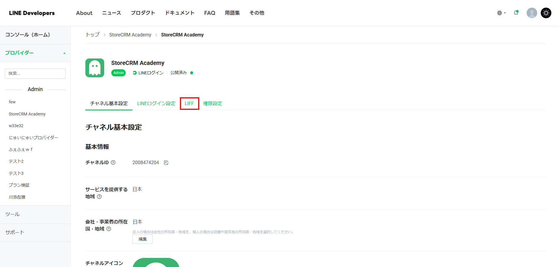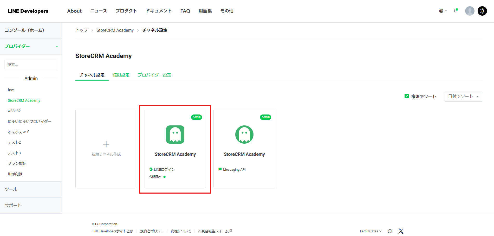 LINE連携設定時に作成した[LINEログインチャネル]を選択します。
