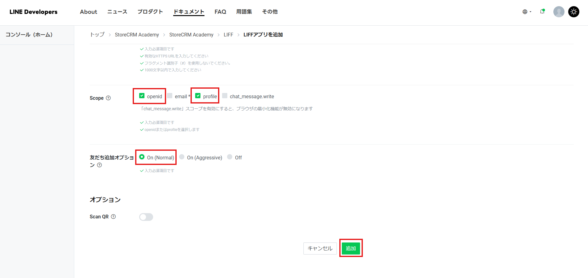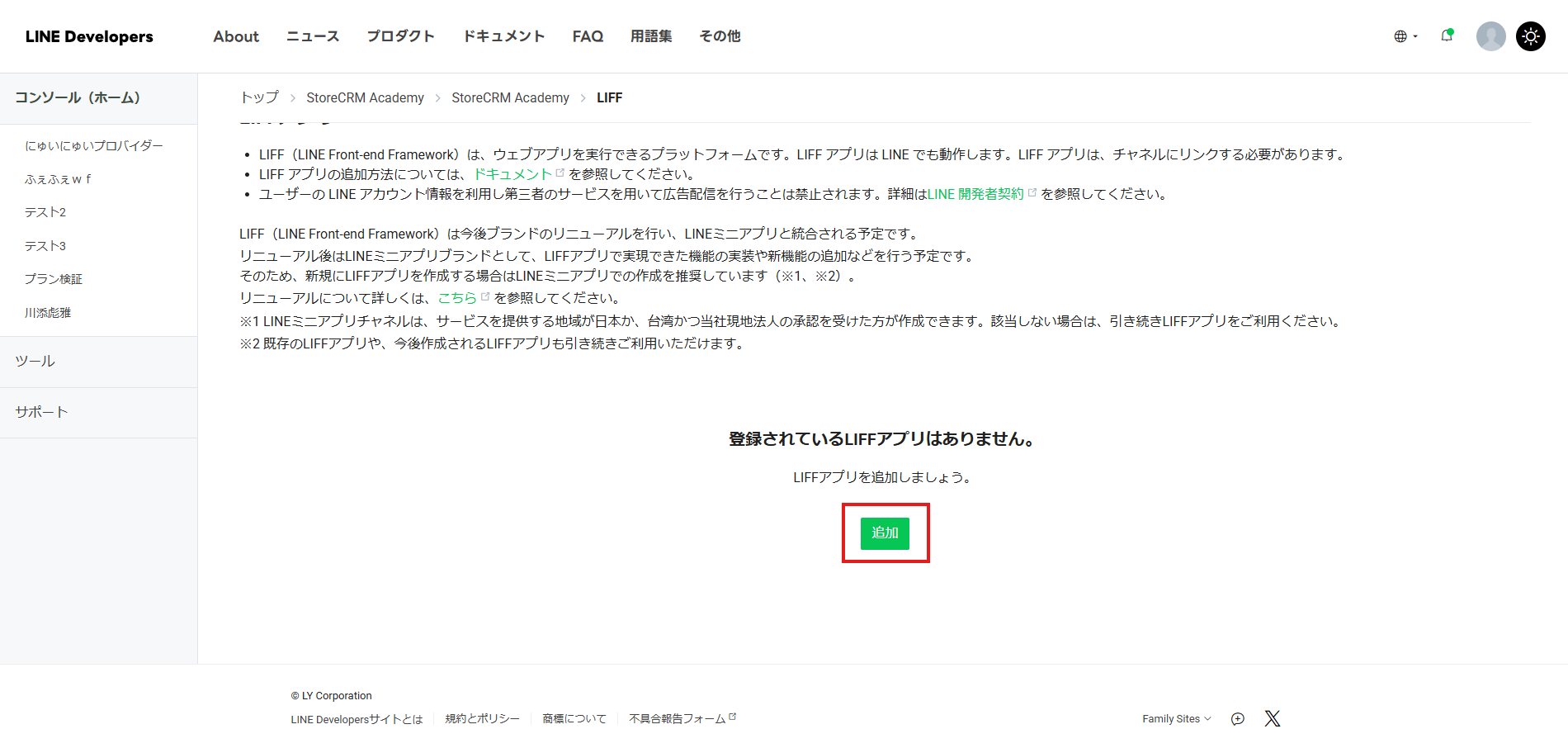 その後、[追加]ボタンを押してLIFFアプリが作成されます。