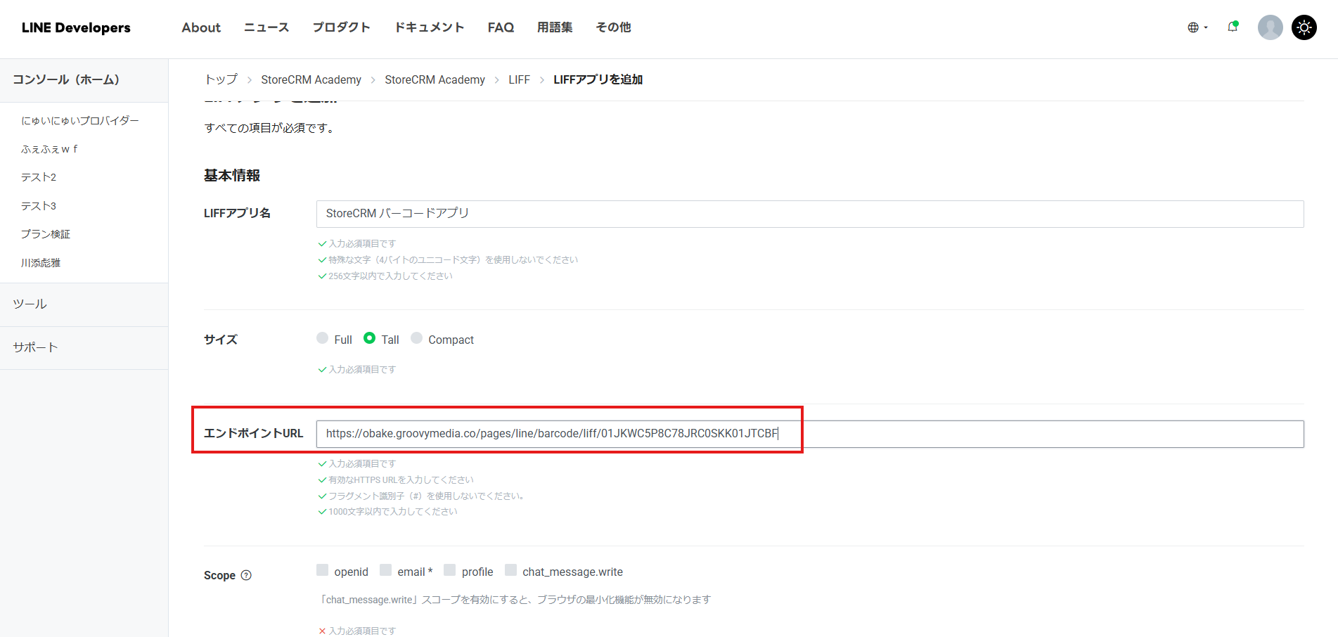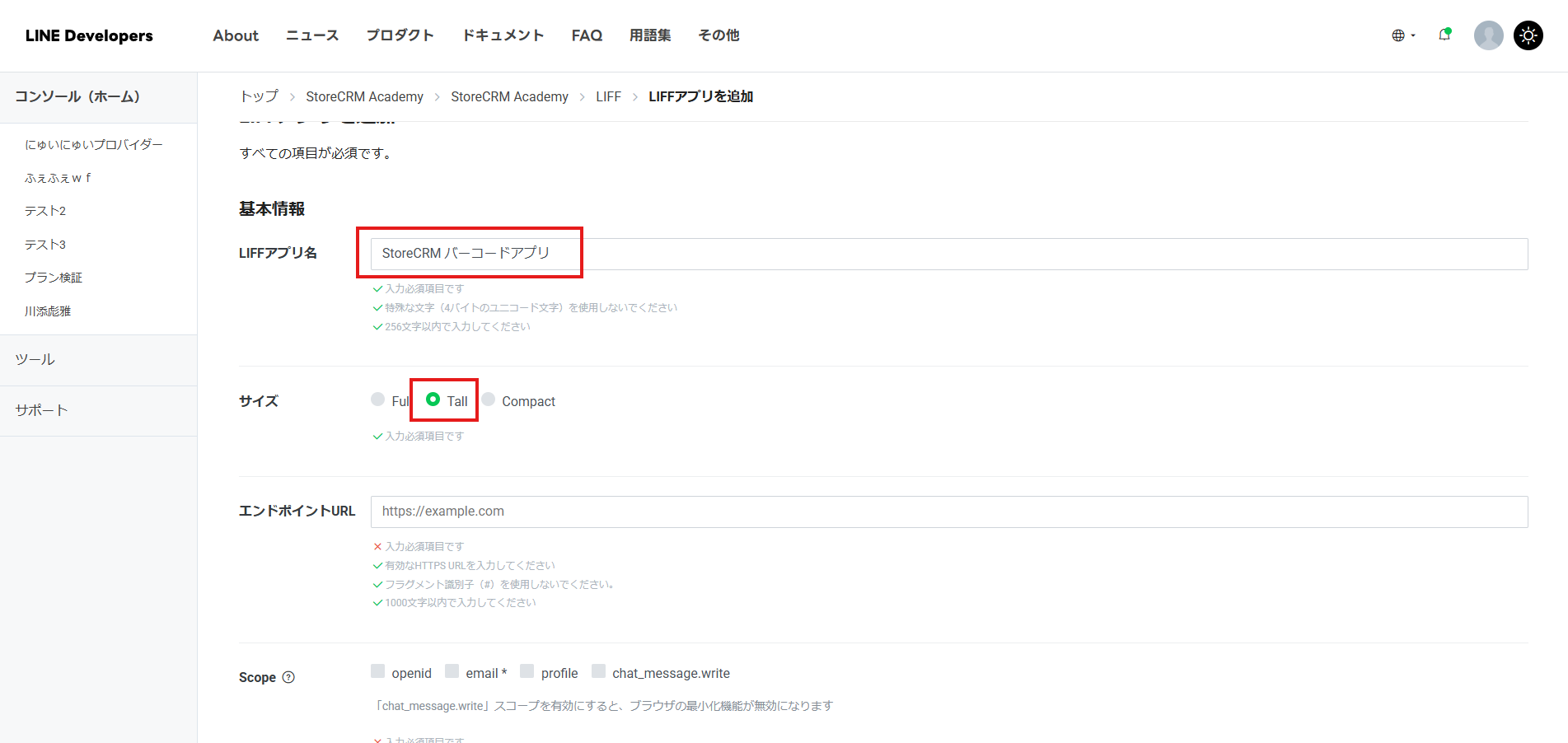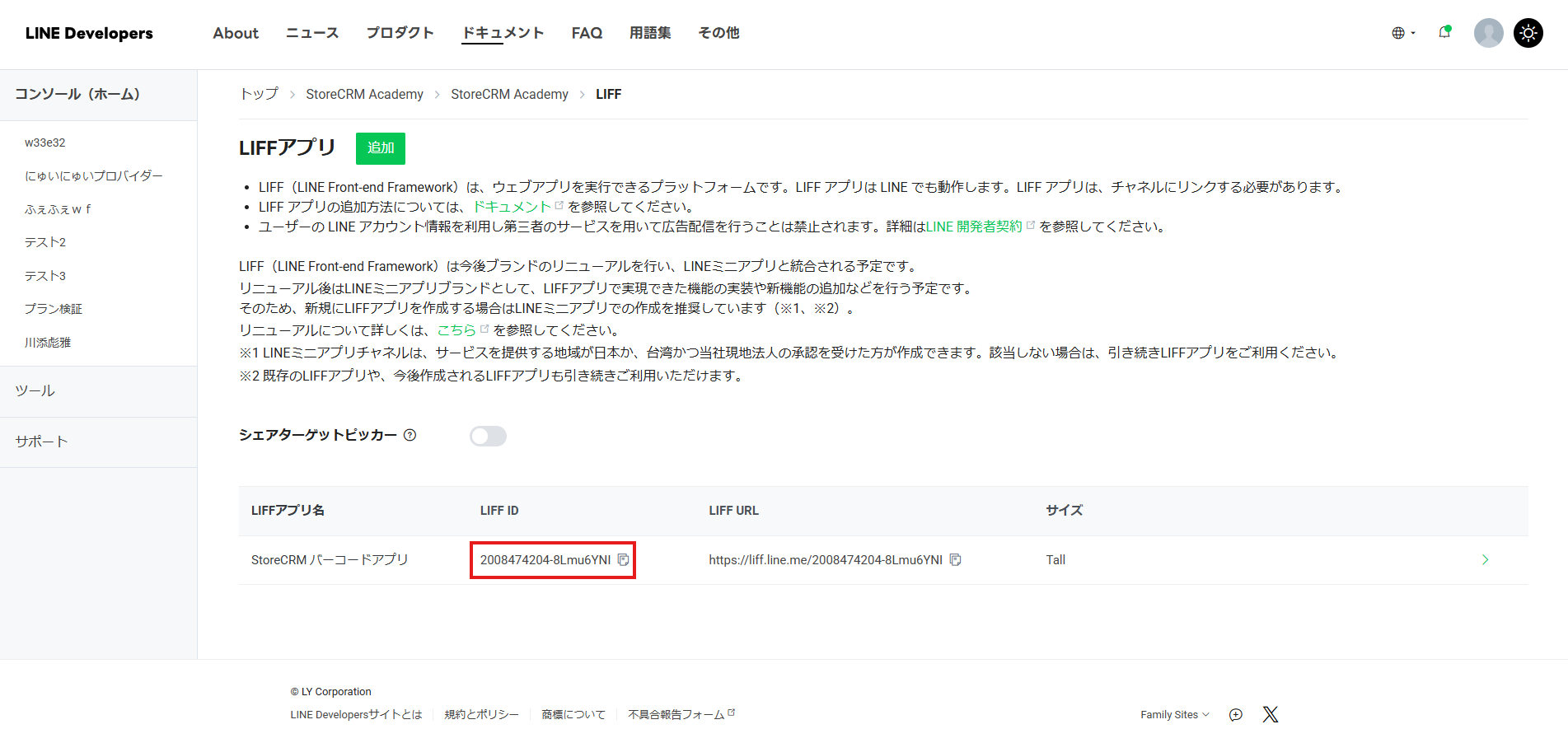 StoreCRMでLINEバーコード表示機能を利用するために、「LIFFアプリ」の作成をおこないます。