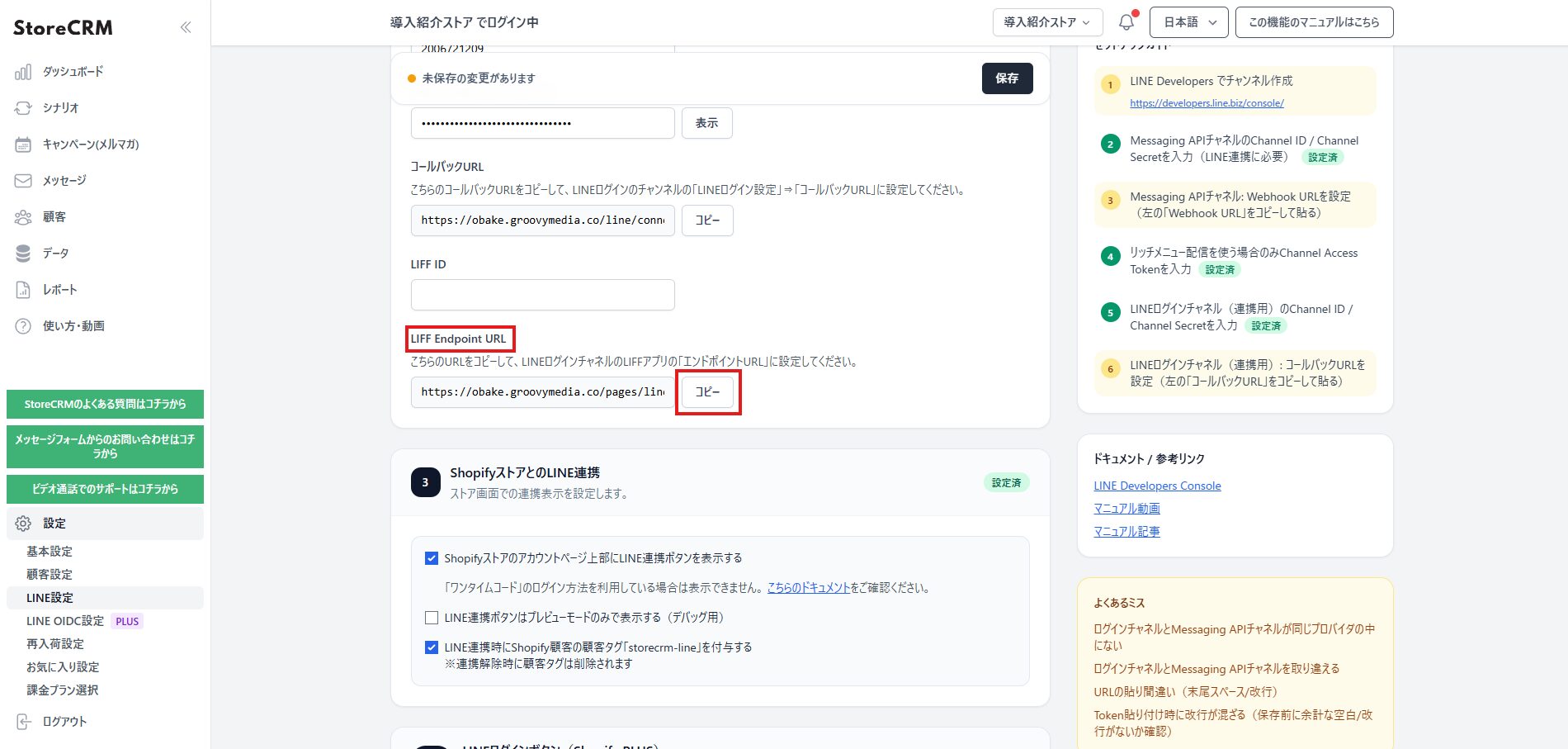 StoreCRMの[設定]→[LINE設定]→[LINEログインチャネル設定(連携用)]に[LIFF Endpoint URL]があるのでそれをコピーします。