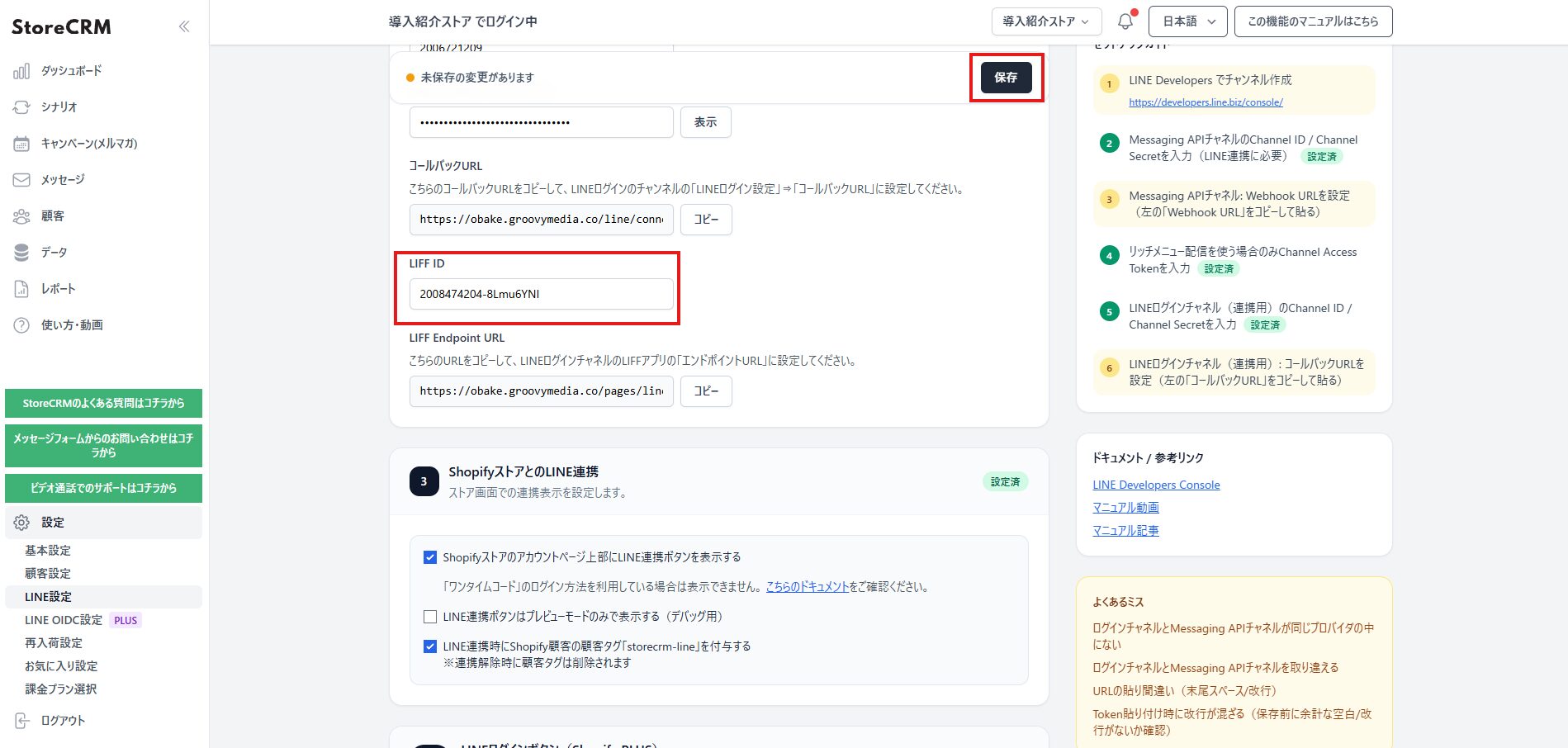 StoreCRMの[設定]→[LINE設定]→[LINEログインチャネル設定(連携用)]に[LIFF ID]の入力欄があるので、コピーした値を貼り付けます。