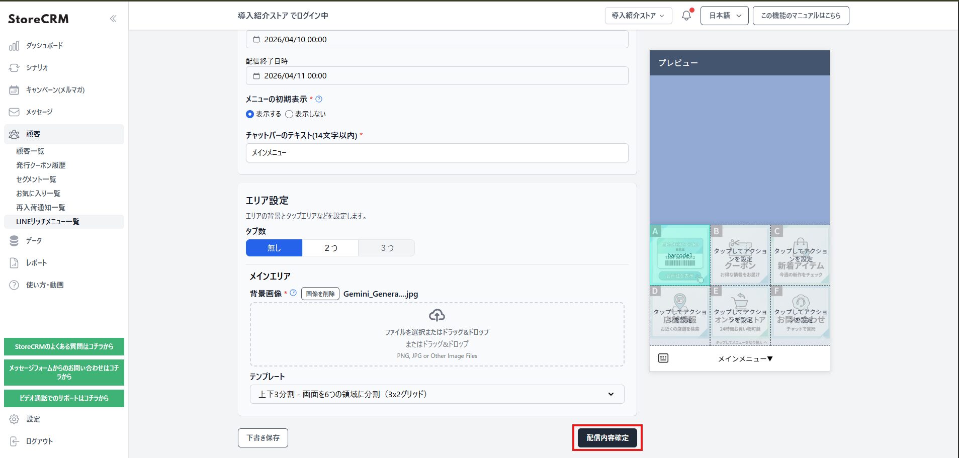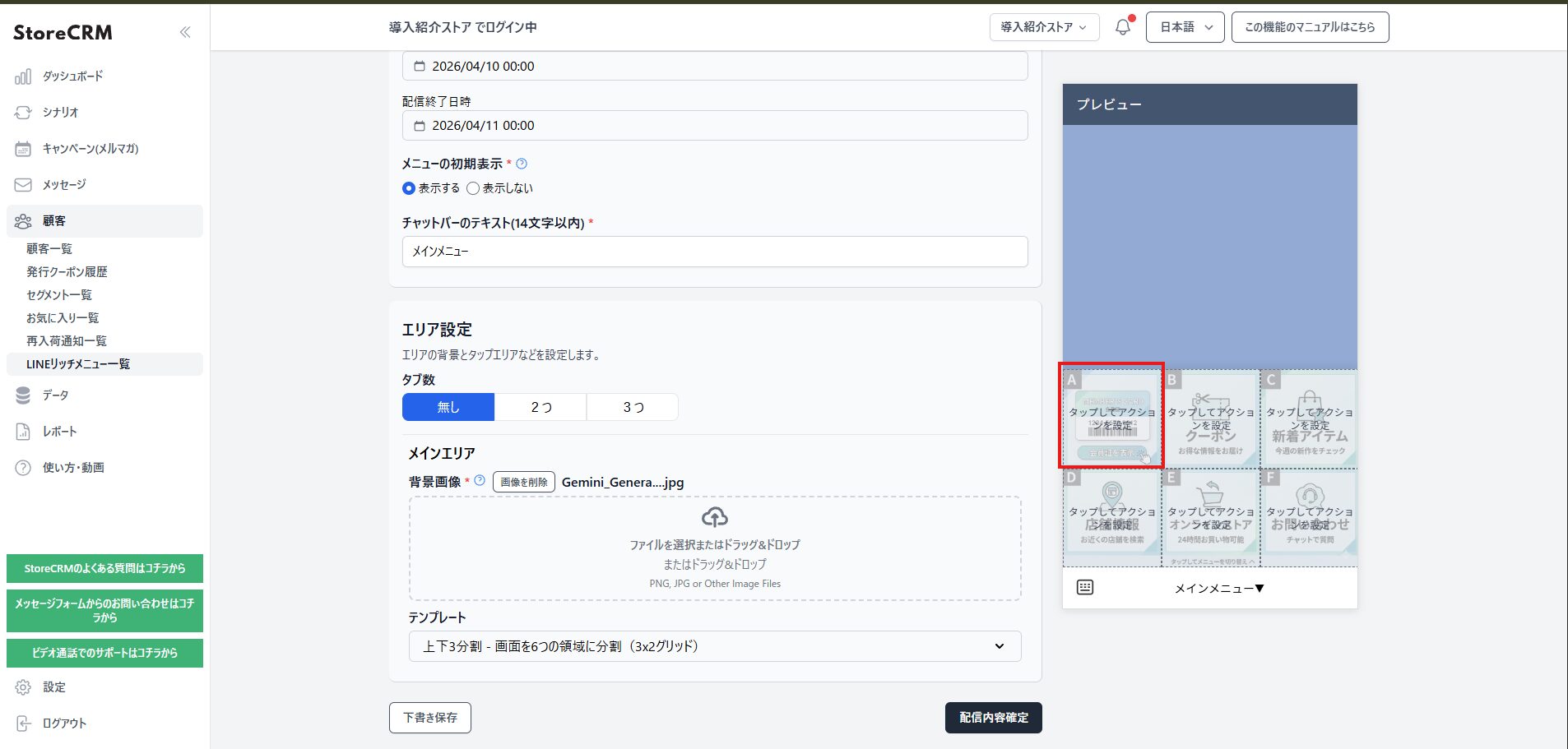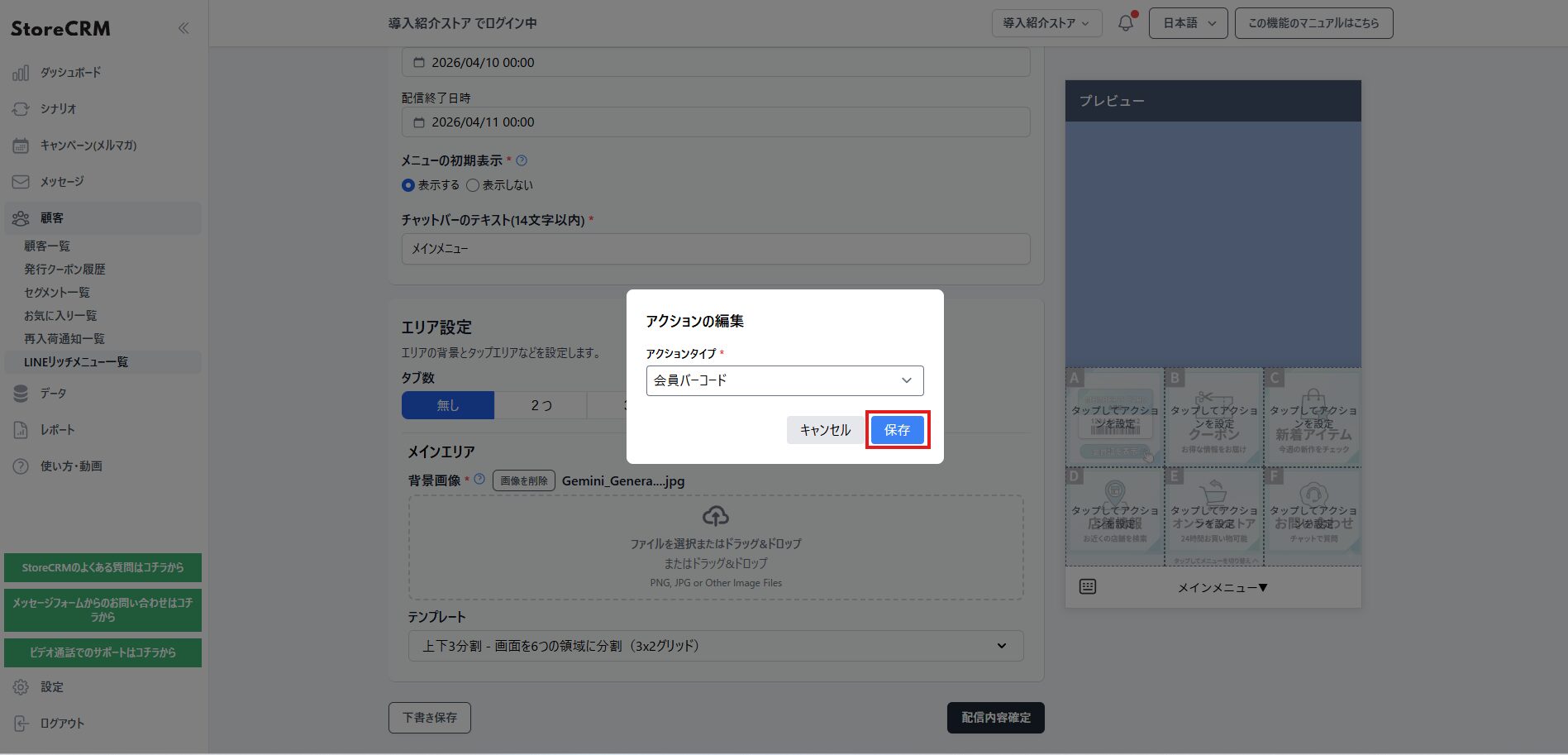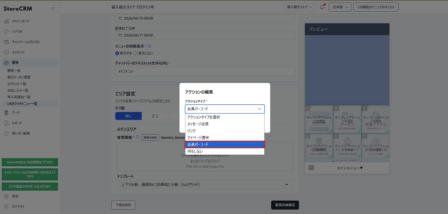 StoreCRMで作成したリッチメニューに会員証表示アクションを追加します。リッチメニューの初期設定がまだの場合は、以下記事を参考に、設定をおこないましょう。