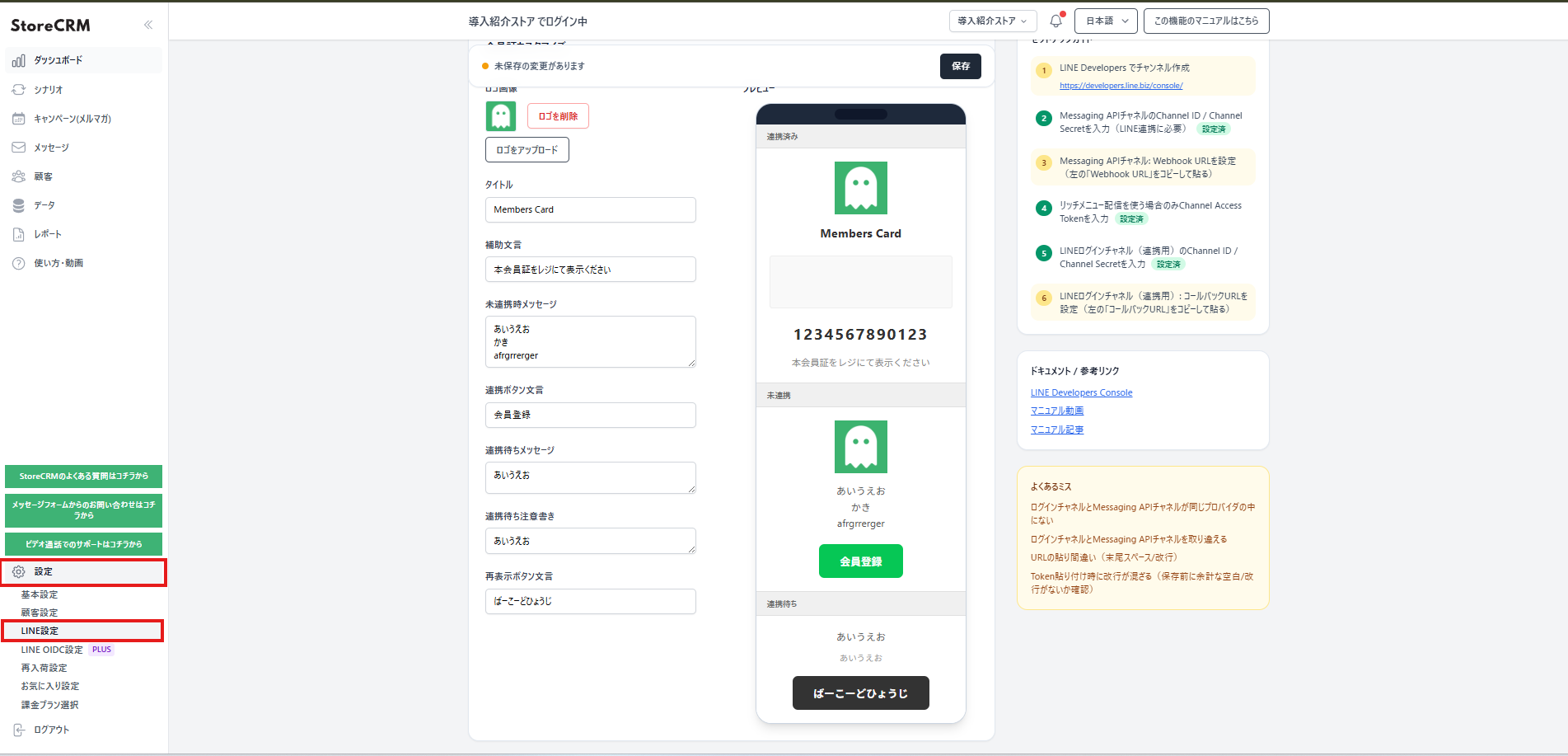 StoreCRMのLINE設定設定の詳細については下記ページを参照してください。