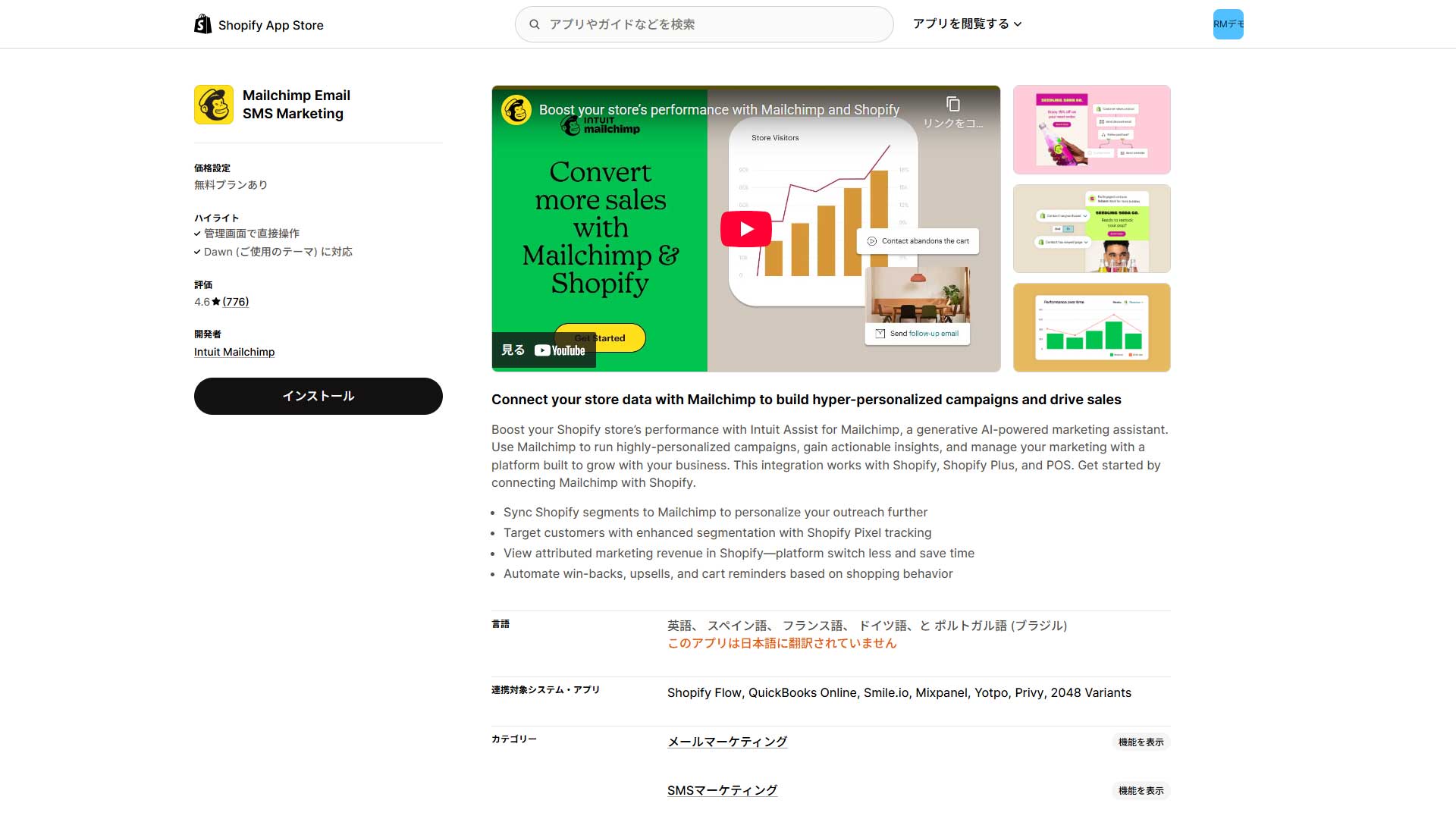 また、MailchimpはShopifyアプリとスタンドアロン型ソフトウェアの両方を提供しています。Shopifyアプリ版では、Shopify内の顧客データや購買履歴と連携でき、ストア運営と統合したマーケティングを実現します。一方、ソフトウェア版(外部Webプラットフォーム)は、Shopify以外のECサイトや複数店舗の統合運用にも対応しています。Klaviyoがデータ分析に強く、Omnisendがコスト効率を重視するのに対し、Mailchimpはグローバル対応力と柔軟な運用形態が特徴的です。