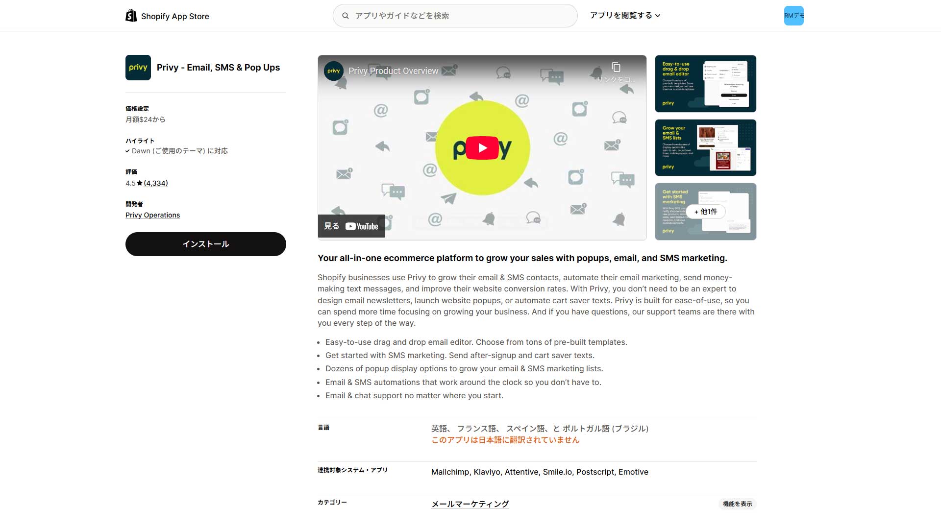 スピンホイール・離脱防止ポップアップ・フォーム作成などの機能でリード獲得を強化し、ニュースレター・SMSキャンペーン・プッシュ通知まで一元化できます。英語UIですが操作は直感的で、低コストで本格的な自動化を実現したいShopifyストアに最適です。
