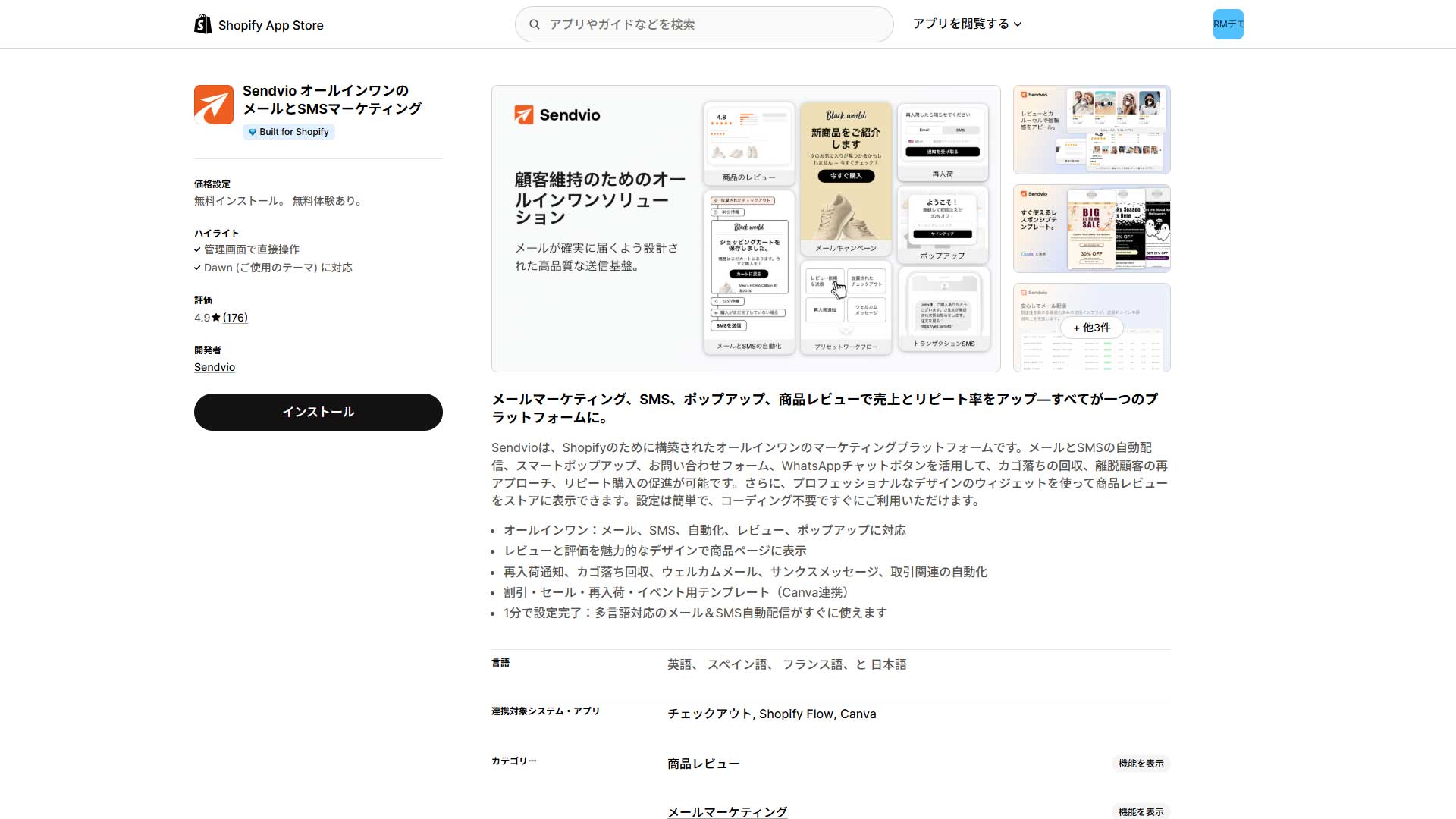 Shopifyのメルマガアプリは、App Storeから簡単にインストールでき、ノーコードで設定変更が可能なため、導入しやすい点が大きな魅力です。日本語の管理画面やサポート対応があるかどうかは、スムーズな運用において重要な要素となります。また、「お気に入り」や「かご落ち」など、顧客の行動に応じて自動でメッセージを送れるかどうかも選定のポイントです。