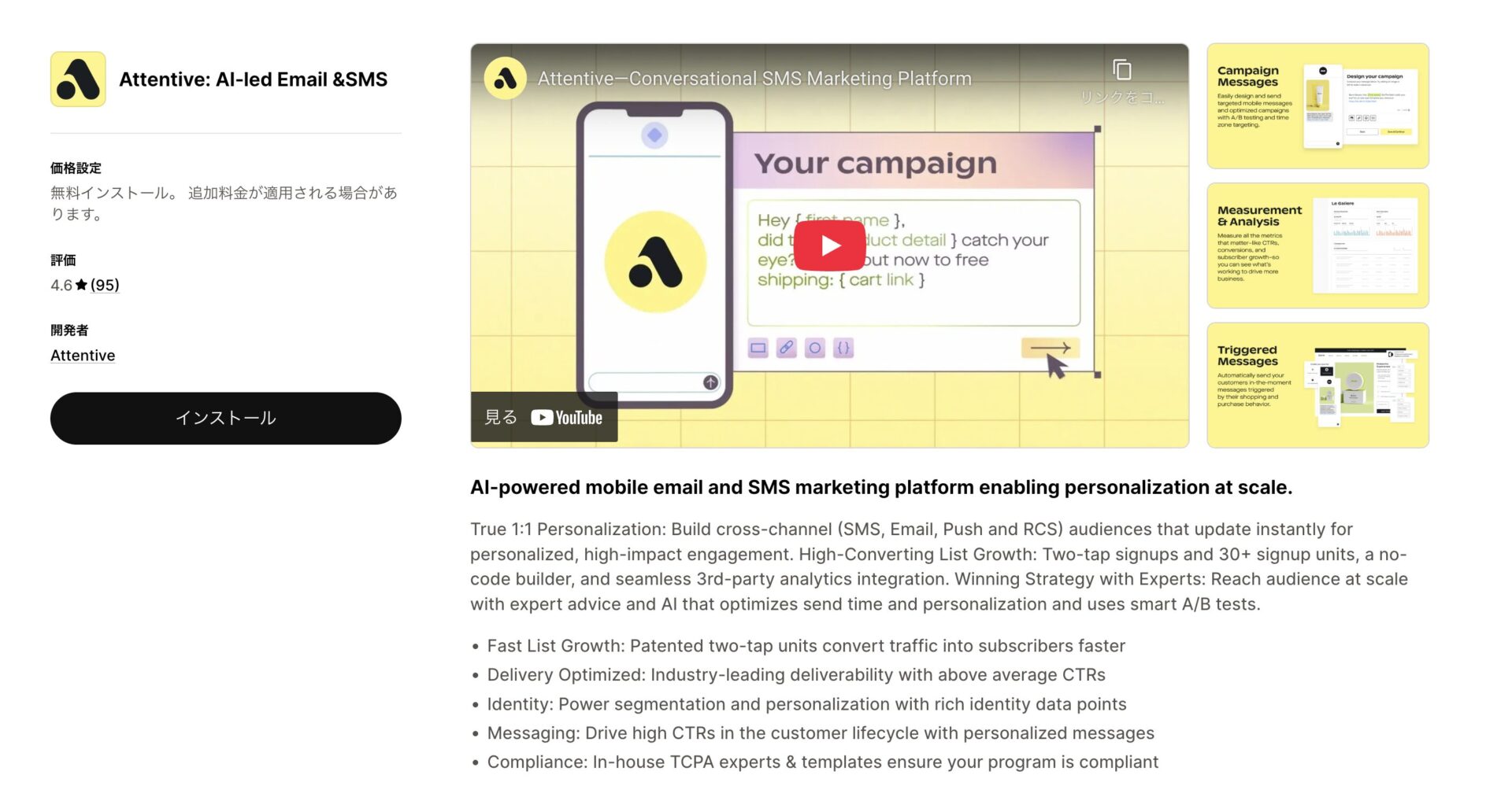 SMS購読者リストの獲得力で他を圧倒するのがAttentiveですが、その強みは北米市場に特化しています。Shopify Plusを利用する大規模ブランドを主なターゲットとし、最大の武器は「Two-Tap」と呼ばれる特許技術です。これは、ユーザーがポップアップ上のボタンをタップするとスマートフォンのメッセージアプリが自動で起動し、送信ボタンを押すだけで登録が完了する仕組みです。