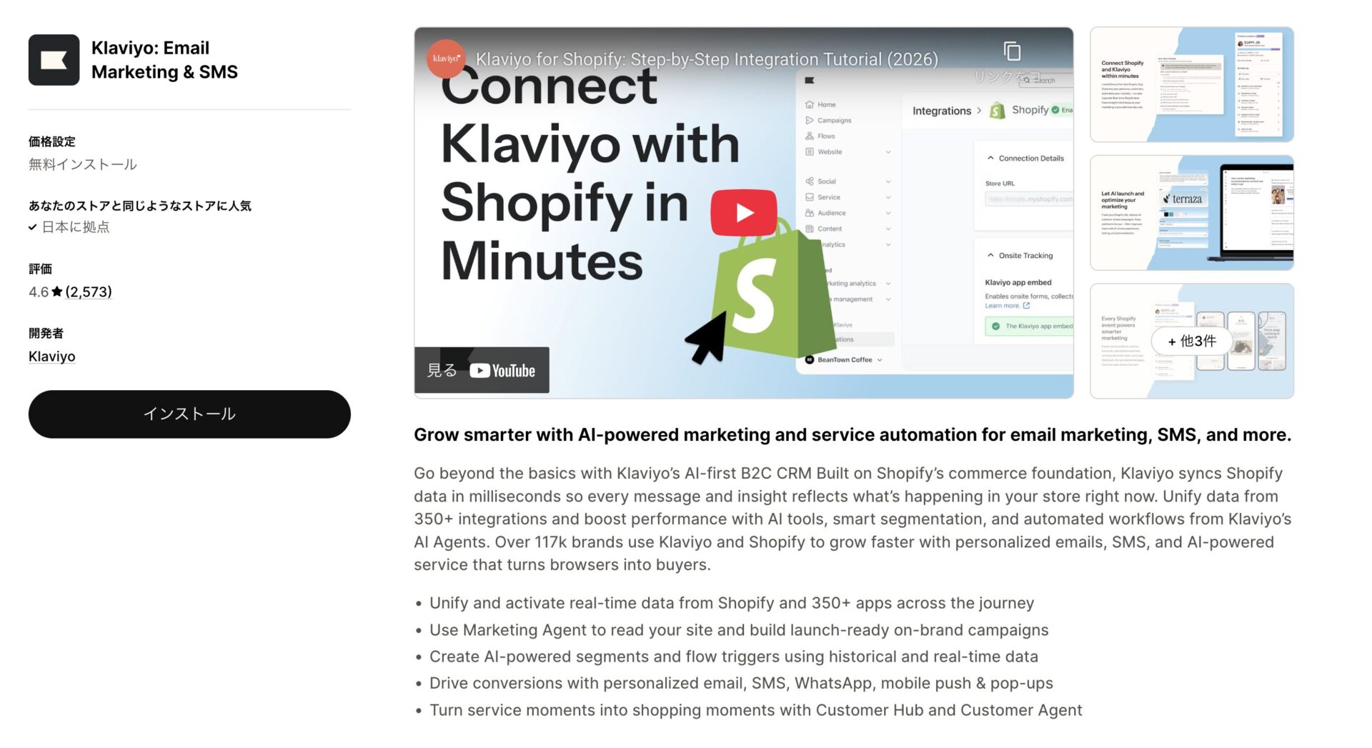 Klaviyoは、EメールとSMSを統合したCRM/MAアプリとして広く知られていますが、日本市場においてはSMS機能が実質的に利用できないという明確な課題があります。Shopifyの顧客データ(購入履歴やサイト内行動など)を深く分析し、「特定の商品を3回見たのに購入していない顧客」といった細かなセグメントに対して自動でアプローチできる点が、Klaviyo最大の強みです。