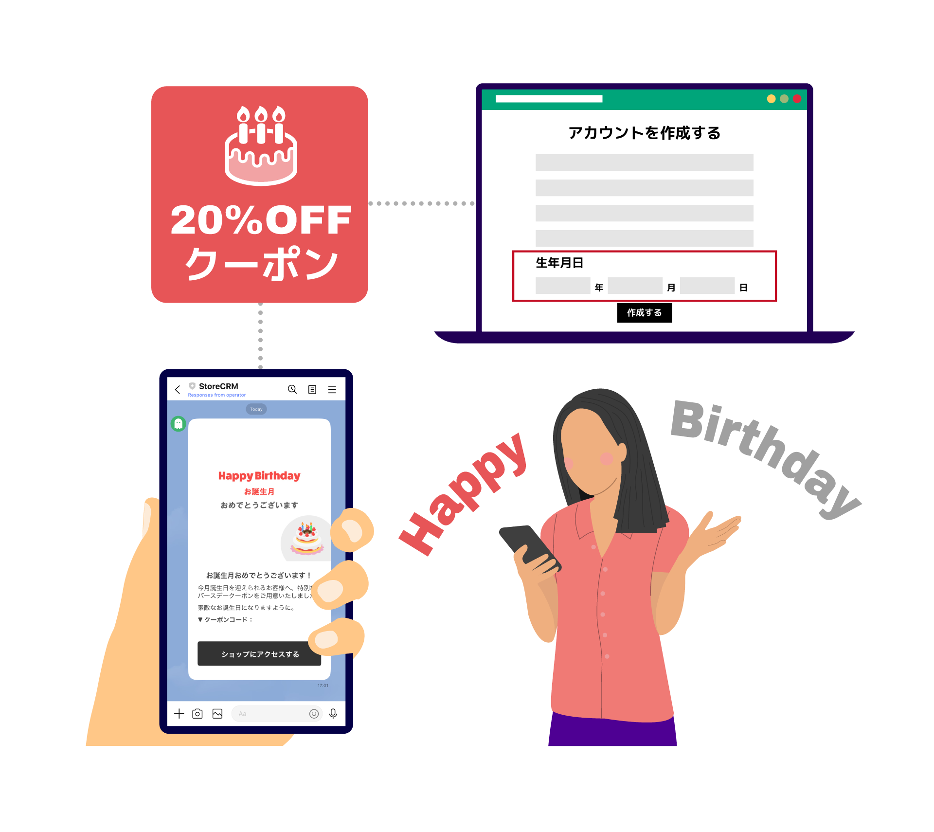 顧客の誕生日をあらかじめ収集し、誕生日の当日や月初に自動クーポンやメッセージを配信します。