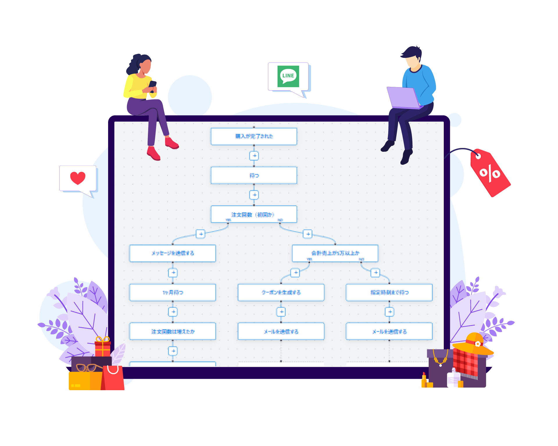 StoreCRMのフローエディタを使えば、テンプレート以上に自由度の高いシナリオが設定できます。