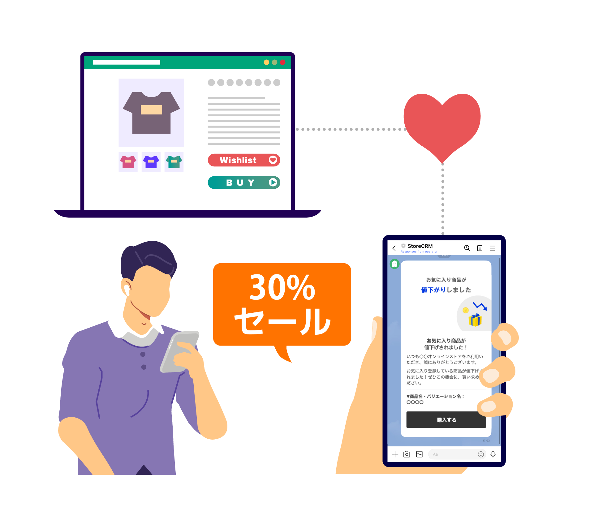 お気に入り登録された商品について、価格変動や再入荷のタイミングで、自動的にメッセージを配信します。