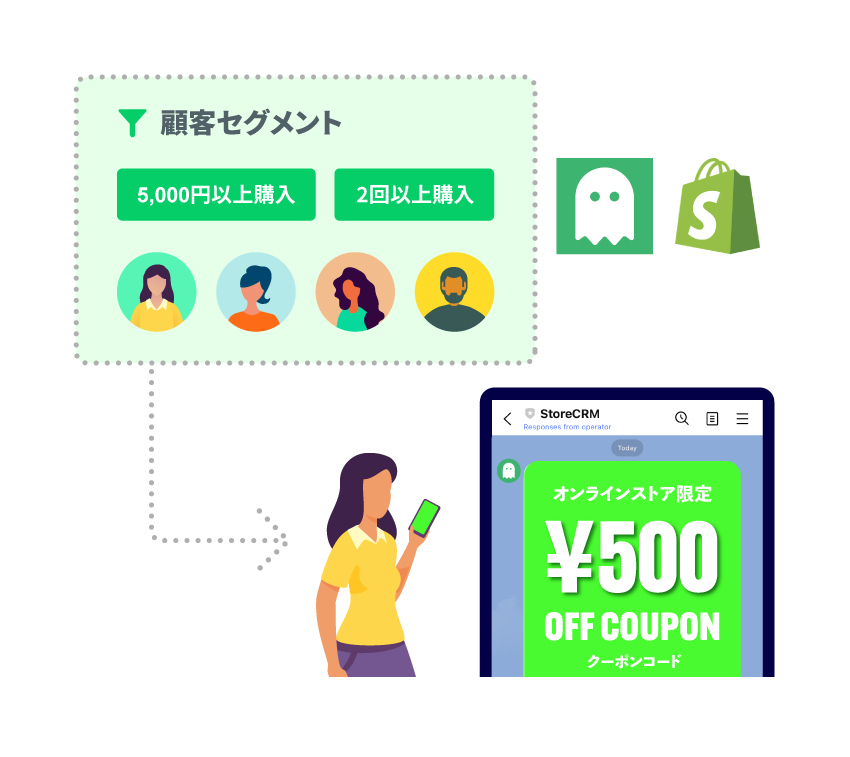 StoreCRMで作成した顧客セグメントに加え、Shopifyで管理している顧客セグメントも活用した、LINEでのセグメント配信が可能です。