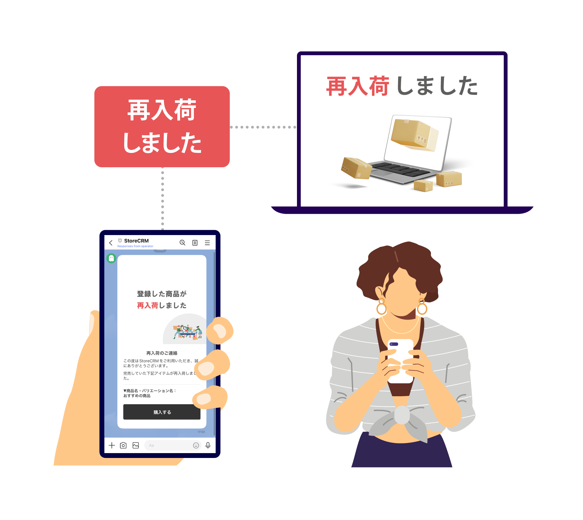 在庫切れの商品が再入荷されたタイミングで、登録済みのお客様に自動的にメッセージを配信します。