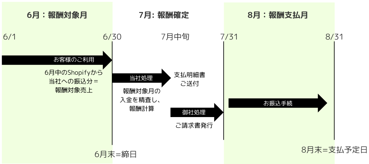 ※エンドクライアントのShopifyへのお支払い金額は米ドルですが、弊社から代理店へのお支払いは日本円とします。変換レート策定のためには報酬対象月末時点の三菱UFJ銀行の米ドル->日本円のTTB相場を利用するものとしますが、為替の急激な変化がある場合、当社判断で報酬対象月のいずれかの日のTTB相場を利用することができることとします。